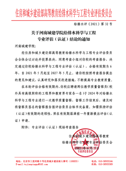 (通讯员:高宏斌)日前,住房和城乡建设部高等教育给排水科学与工程专业评估委员会下发《关于球王会体育给排水科学与工程专业评估(认证)结论的通知》(给排水评﹝2021﹞第32号)文件,经住房和城乡建设部高等教育给排水科学与工程专业评估委员会全体会议讨论并投票表决,同意考查小组对球王会体育的考查报告,决定通过球王会体育给排水科学与工程专业评估(认证),合格有效期为6年,2021年5月起至2027年5月止。