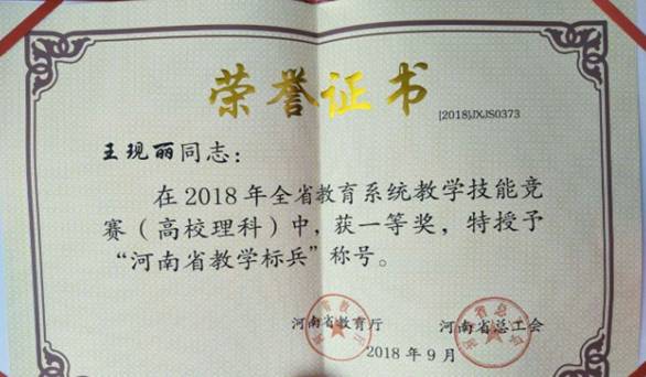 (通讯员 贾彩云)近日,河南省教育厅、河南省总工会联合下发《关于表彰2018年全省教学技能竞赛获奖个人的决定》(豫工文〔2018〕82号),公司王现丽老师荣获河南省教育系统教学技能竞赛(高校理科)一等奖,同时被授予“河南省教学标兵”荣誉称号。