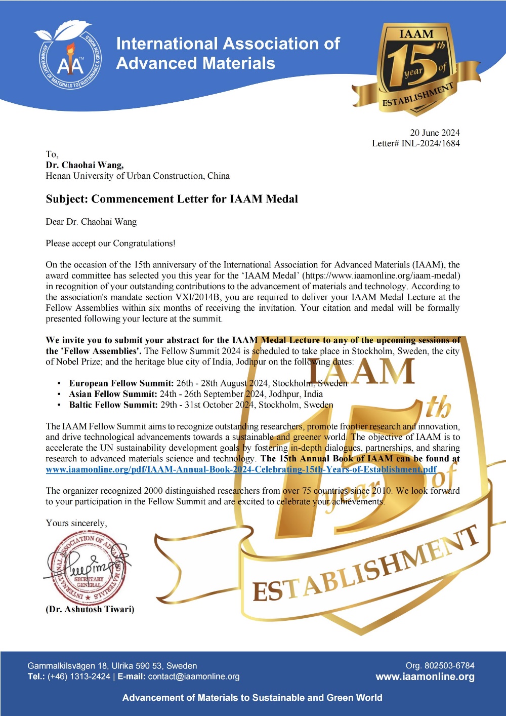 日前,公司球王会王超海教授荣获国际先进材料学会(International Association of Advanced Materials, IAAM)颁发的IAAM青年科学家奖章(IAAM Young Scientist Medal),以表彰他在环境纳米材料领域做出的突出贡献,邀请其参加今年9月份在瑞典举行的颁奖典礼并做青年科学家奖章报告。