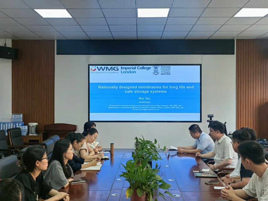 2024年8月23日上午,英国斯旺西大学谭瑞博士受邀来公司开展学术交流,并作了题为《Rationally designed membranes for long-life and safe energy systems》的精彩报告。报告由球王会副经理姜忠峰主持,河南省绿色低碳水处理技术与水资源利用国际联合实验室、河南省水体污染防治与修复重点实验室研究人员及联培研究生聆听了谭瑞博士带来的新型导电聚合膜材料及电池储能装置的前沿科学知识。