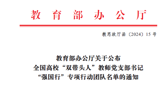 近日,教育部办公厅关于2024年全国高校“双带头人”教师党支部书记“强国行”专项行动团队名单正式揭晓,公司教工第一党支部成功入选。